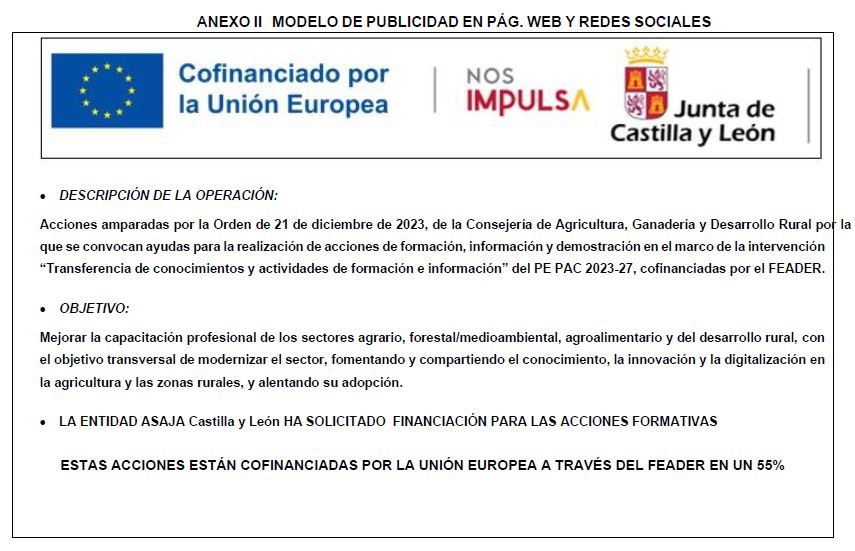 Las acciones formativas están amparadas por la Orden de 21 de diciembre de 2023, de la Consejería de Agricultura, Ganadería y Desarrollo Rural por la que se convocan ayudas para la realización de acciones de formación, información y demostración en el marco de la intervención “Transferencia de conocimientos y actividades de formación e información” del PE PAC 2023-27, cofinanciadas por el FEADER y están dirigidas a todos los trabajadores del sector agrario y agroalimentario, y aquellos interesados en incorporarse a estos sectores.