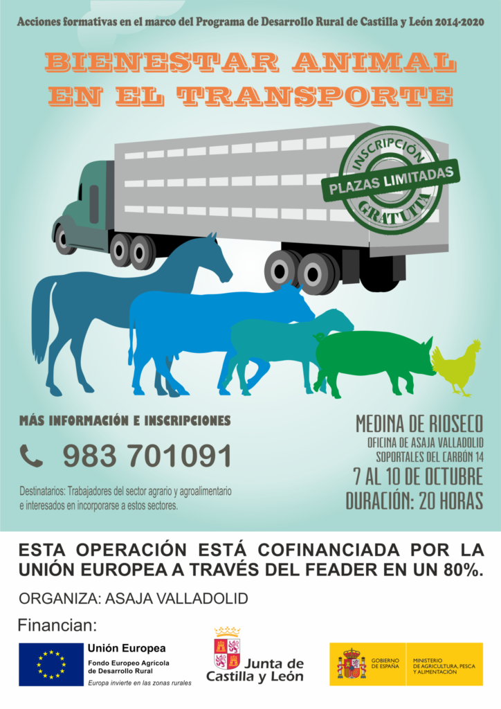 ASAJA Valladolid organiza del 7 al 10 de octubre en Medina de Rioseco un curso de Bienestar Animal en el Trasporte en una operación cofinancianda por la Unión Europea a través del FEADER en un 80%.