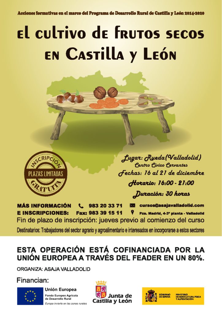 ASAJA Valladolid organiza del 16 al 21 de diciembre en Rueda (Valladolid) un curso gratuito sobre el cultivo de frutos secos en Castilla y León en una operación cofinanciada por la Unión Europea a través del FEADER en un 80%.