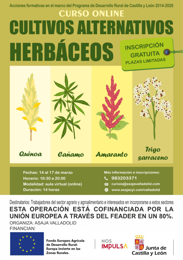 ASAJA Valladolid organiza un curso gratuito online de Cultivos alternativos herbáceos en una operación cofinanciada por la Unión Europea a través del FEADER en un 80%.