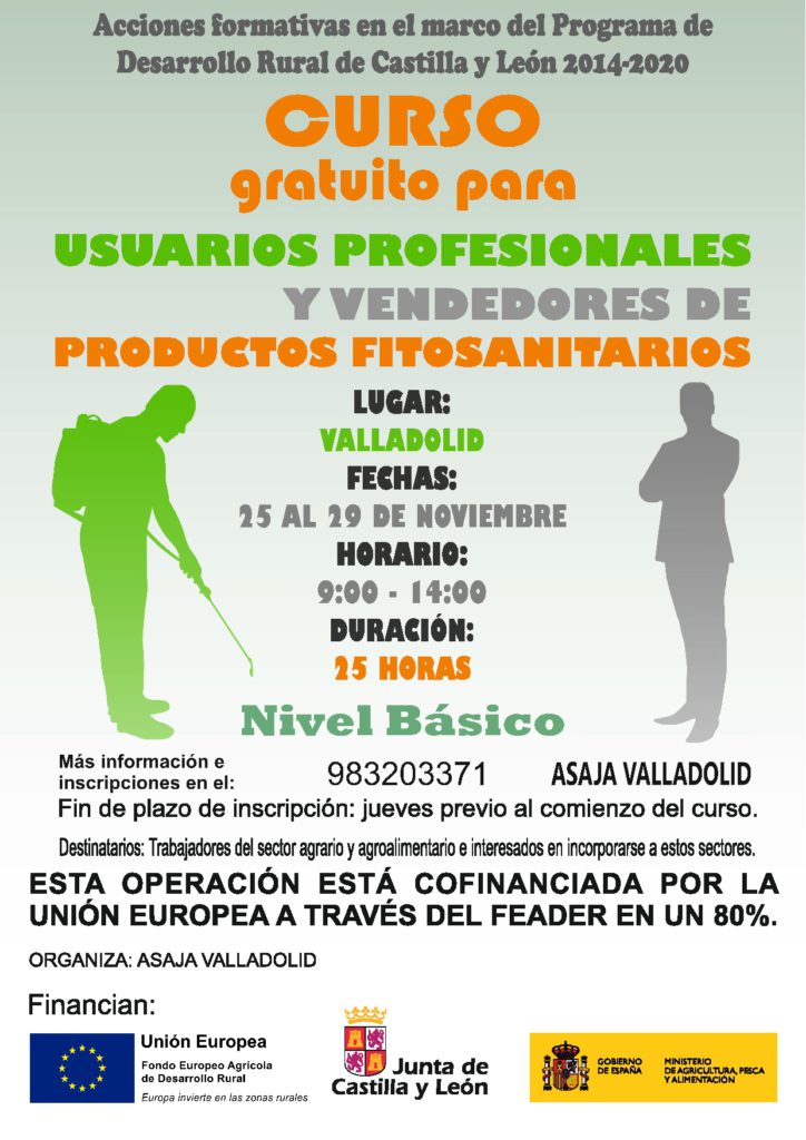 ASAJA Valladolid organiza del 25 al 29 de noviembre en las oficinas de ASAJA VALLADOLID un curso gratuito para usuarios profesionales y vendedores de productos fitosanitarios (Nivel Básico) en una operación cofinanciada por la Unión Europea a través del FEADER en un 80%.