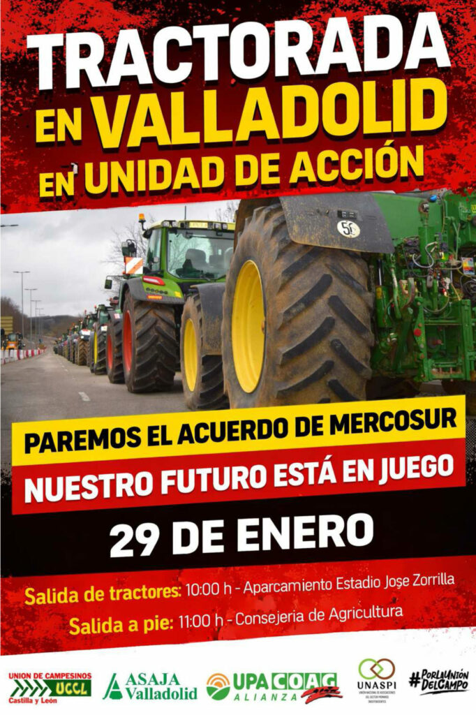 En unidad de acción, UCCL Valladolid, ASAJA Valladolid, Alianza UPA-COAG Valladolid, UNASPI y Por la Unión del Campo han convocado una tractorada que se une a las que se celebrarán por toda España en esa misma fecha
