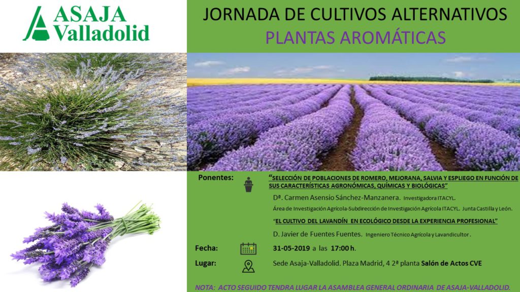 El próximo viernes 31, a partir de las 17.00 horas, tendrá lugar en el Salón de Actos de la CVE (Plaza Madrid 4. Segunda Planta) una jornada sobre el cultivo de plantas aromáticas organizada por ASAJA Valladolid.