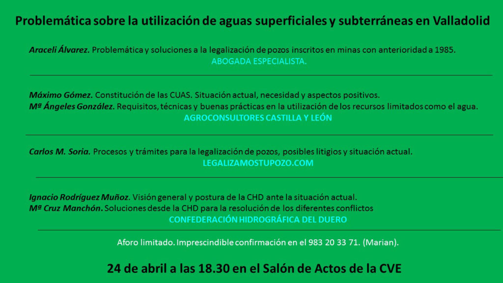 Por su parte, el comisario de aguas de la Confederación Hidrográfica del Duero, Ignacio Rodriguez Muñoz y la jefa de Servicios de las Comunidades de la CHD, María Cruz Manchón ofrecerán) explicarán las soluciones propuestas desde la CHD para la resolución de los diferentes conflictos: utilización del agua, legalización de pozos, evitar las sanciones y las diferentes solicitudes y trámites que se necesitan para tener todo en regla.