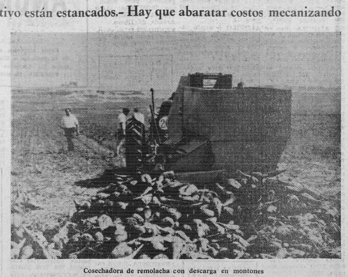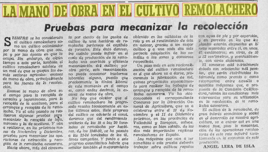 “Siempre se ha considerado al cultivo remolachero como un cultivo colonizador por la mano de obra que ocupa y por las épocas en que la ocupa. Sin embargo, de algún tiempo a esta parte, también el cultivo remolachero adolece de un mal de que se quejan los demás sectores agrícolas: escasez de mano de obra principalmente para las faenas de la recolección. Hasta ahora, más del 50% de los gastos de cultivo de una hectárea de remolacha pertenece al capítulo de jornales. Este dato demuestra cuánto puede influir en el costo de producción de la remolacha una acertada y eficiente mecanización del cultivo. Por otra parte, esta mecanización no puede ocasionar trastornos laborales alguno, puesto que precisamente la tónica laboral de este momento en el campo es como antes decimos la escasez de mano de obra. No hay que olvidar que el cultivo remolachero ha progresado mucho técnicamente en estos últimos años. Este progreso del cultivo se advierte, si consideramos que del rendimiento unitario de las 18 a las 20 toneladas de remolacha por hectárea de los 1940-50 se ha pasado a las 21-24 toneladas de las últimas campañas. Junto a este progreso cuantitativo habrá que señalar también el mejoramiento obtenido las calidades de la raíz y en el rendimiento de esta en azúcar gracias a un mejor cultivo y a una cada día más perfecta adaptación de las semillas a las zonas y comarcas respectivas. Un paso más en esta racionalización del cultivo remolachero es el que ahora va a darse procurando la fabricación de máquinas proyectadas especialmente para realizar los trabajos de arranque y recogida de la remolacha. Ya ha sido convocado el correspondiente concurso por la Dirección General de Agricultura, que va a celebrarse en las provincias de Valladolid y Zaragoza. Cabeceras, como bien he sabido, de las dos más importantes regiones remolacheras de España.”